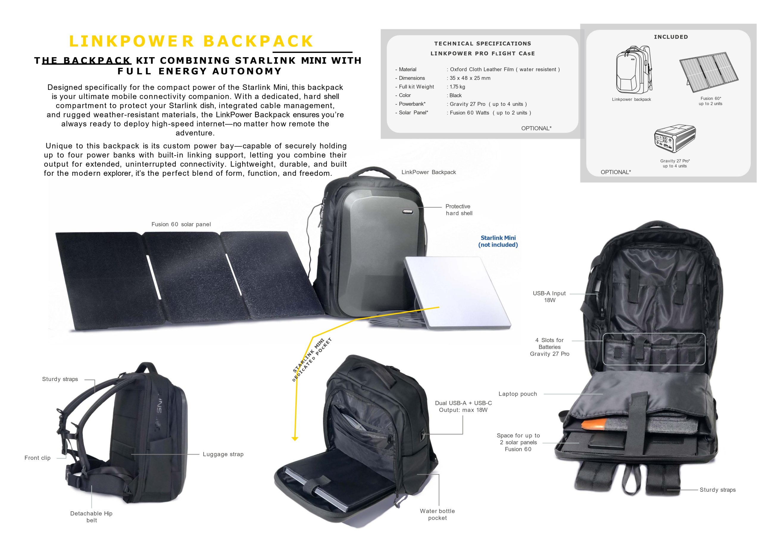Designed specifically for the compact power of the Starlink Mini, this backpack is your ultimate mobile connectivity companion. With a dedicated, hard shell compartment to protect your Starlink dish, integrated cable management, and rugged weather-resistant materials, the LinkPower Backpack ensures you’re always ready to deploy high-speed internet—no matter how remote the adventure.